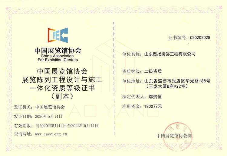 中國(guó)展覽館協(xié)會(huì)展覽陳列工程設(shè)計(jì)與施工一體化資質(zhì)等級(jí)證書(shū)